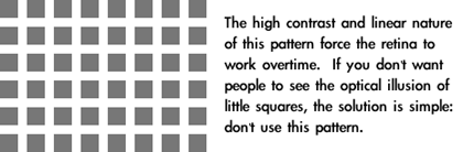 Patterns that use grids face another problem. An optical illusion can be created by high contrast areas. This is due to the way the human retina works, and the only true method for avoiding this problem is to change the pattern itself.