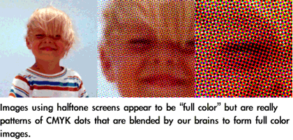 The discussion of color thus far has been based upon the principles of reflective color, meaning when light bounces and reflects off an object. Things change when the color is emanating from light. When light is used to create color, yellow is no longer a primary and is replaced by green. Instead of mixing yellow, red, and blue to create color, light uses red, green and blue (RGB). This is the same technique used in televisions, which is why if you look very closely at a CRT screen you can actually see the separate RGB pixels. The RGB color mixing process is the most common option available in computer software, primarily because most computers present information to users with CRT screens or LCD’s, both of which use RGB color mixing.Another color process that is widely used is CMYK (cyan, magenta, yellow, and black). This is the process used for most print reproduction, whether it is a color inkjet printer or large printing presses for books and magazines. CMYK color mixing is a common option in most computer graphics software.